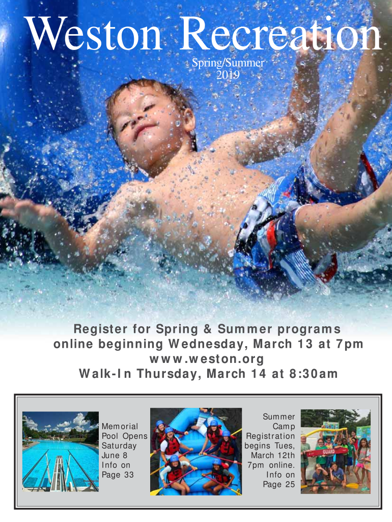 Weston Recreation Spring/Summer 2019Register for Spring & Summer programs online beginning Wednesday, March 13 at 7pm www.weston.org Walking Thursday, March 14 at 8:30amMemorial Pool Opens Saturday,