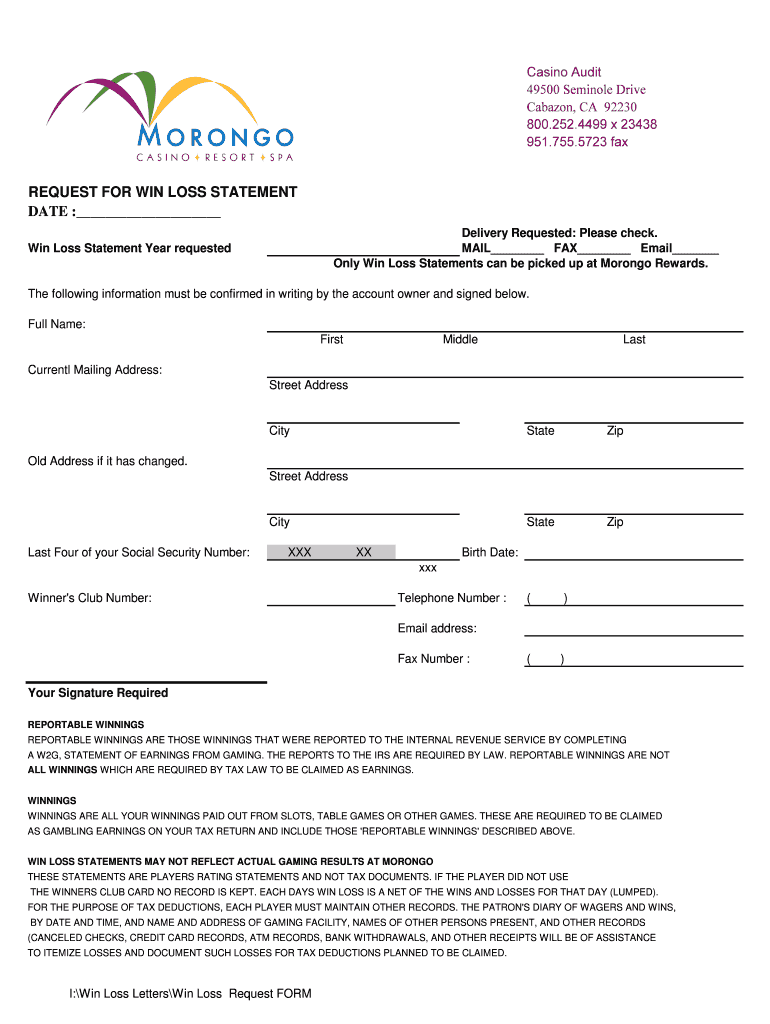 Casino Audit 49500 Seminole Drive Amazon, CA 92230 800.252.4499 × 23438 951.755.5723 frequent FOR WIN LOSS STATEMENT DATE : Delivery Requested: Please check. MAIL FAX Email Only Win Loss Statements