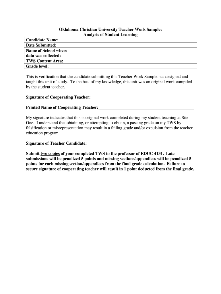 Oklahoma Christian University Teacher Work Sample: Analysis of Student Learning Candidate Name: Date Submitted: Name of School where data was collected: TWS Content Area: Grade level: This is verification