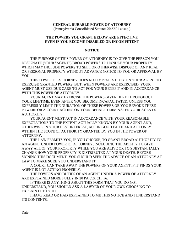 GENERAL DURABLE POWER OF ATTORNEY (Pennsylvania Consolidated Statutes 205601 et seq.) THE POWERS YOU GRANT BELOW ARE EFFECTIVE EVEN IF YOU BECOME DISABLED OR INCOMPETENT NOTICE THE PURPOSE OF THIS