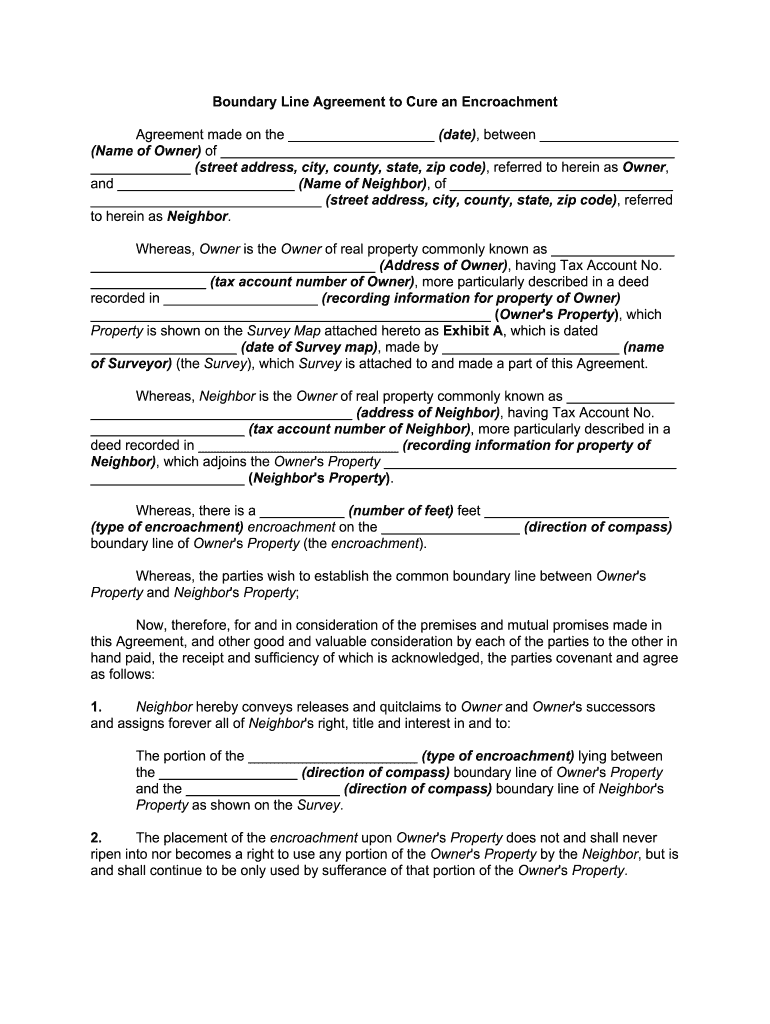 A boundary line agreement is a legal document designed to resolve disputes concerning property boundaries between adjacent landowners. This agreement is essential for addressing encroachment issues, where one property owner may have intruded upon another's land, often leading to potential conflicts. By defining the property lines clearly, the agreement mitigates risks of ongoing or future disputes.