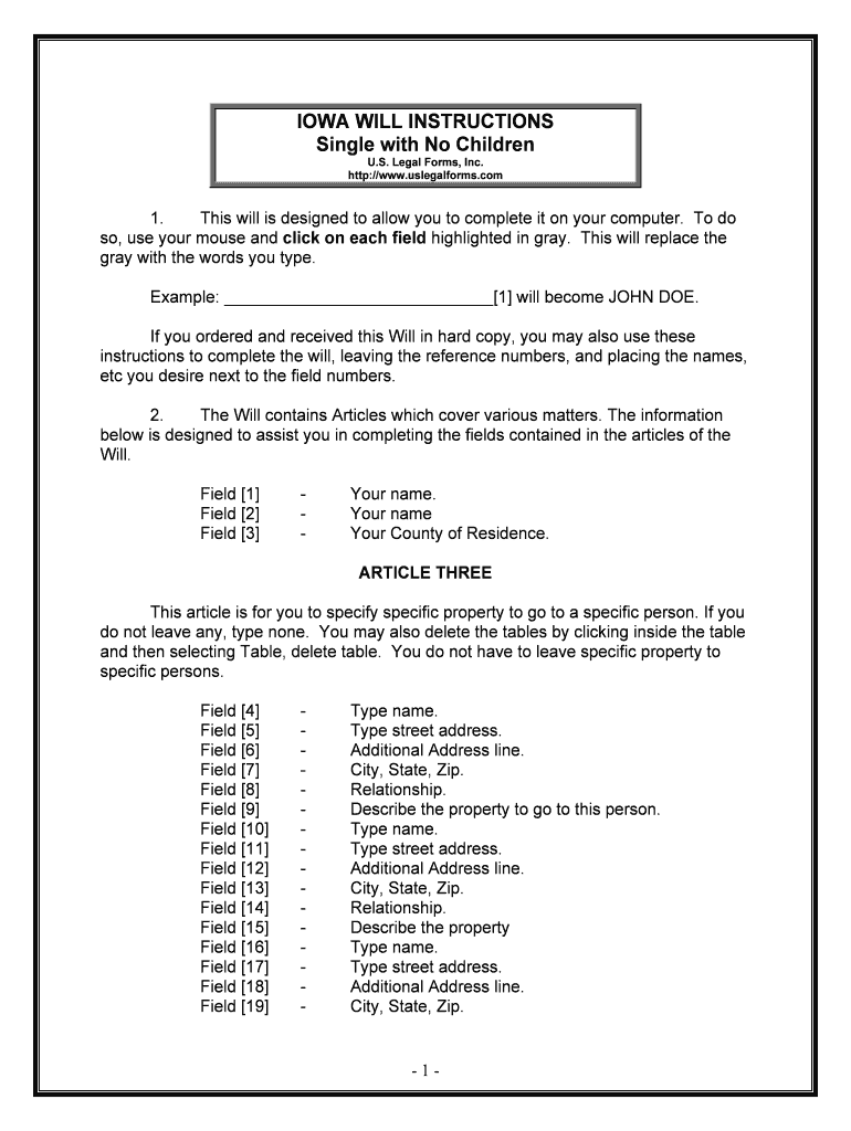 IOWA WILL INSTRUCTIONS Single with No Children U.S. Legal Forms, Inc. http://www.uslegalforms.com1. This will is designed to allow you to complete it on your computer. To do so, use your mouse and