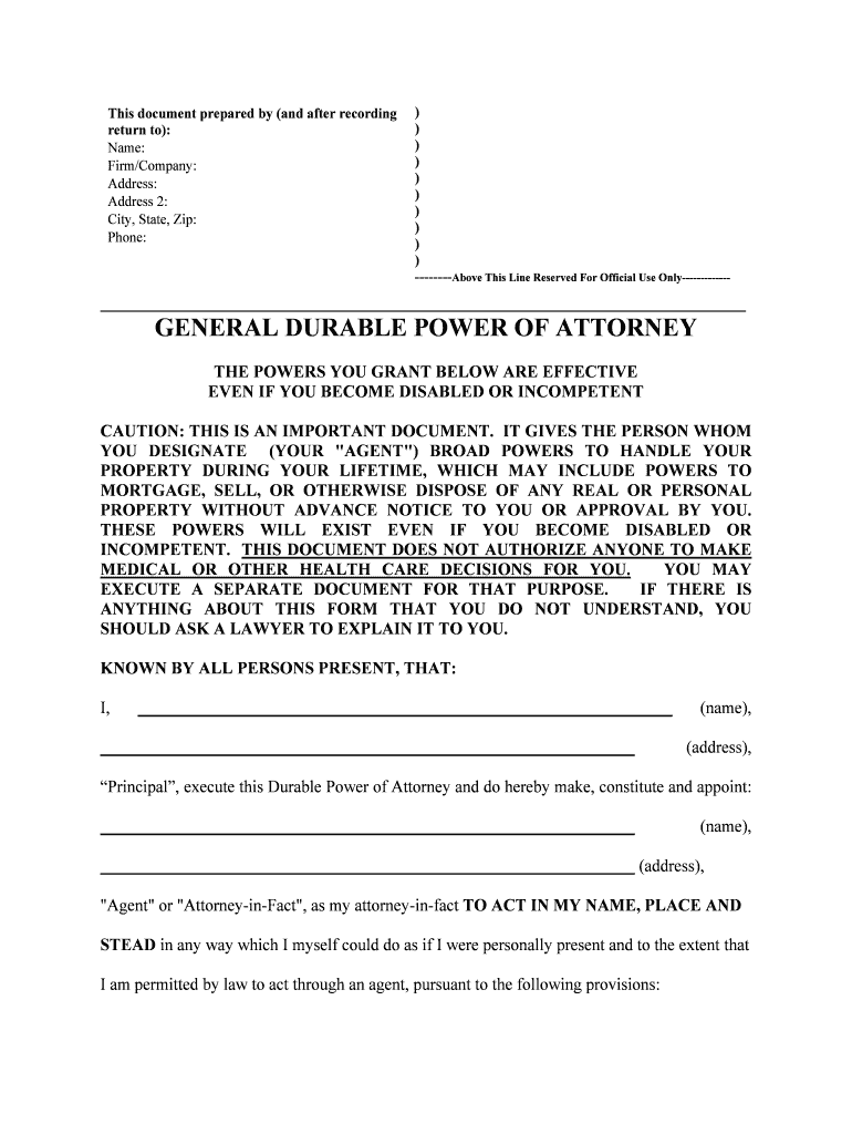 This document prepared by (and after recording return to): Name: Firm/Company: Address: Address 2: City, State, Zip: Phone:)))))))))) Above This Line Reserved For Official Use OnlyGENERAL DURABLE