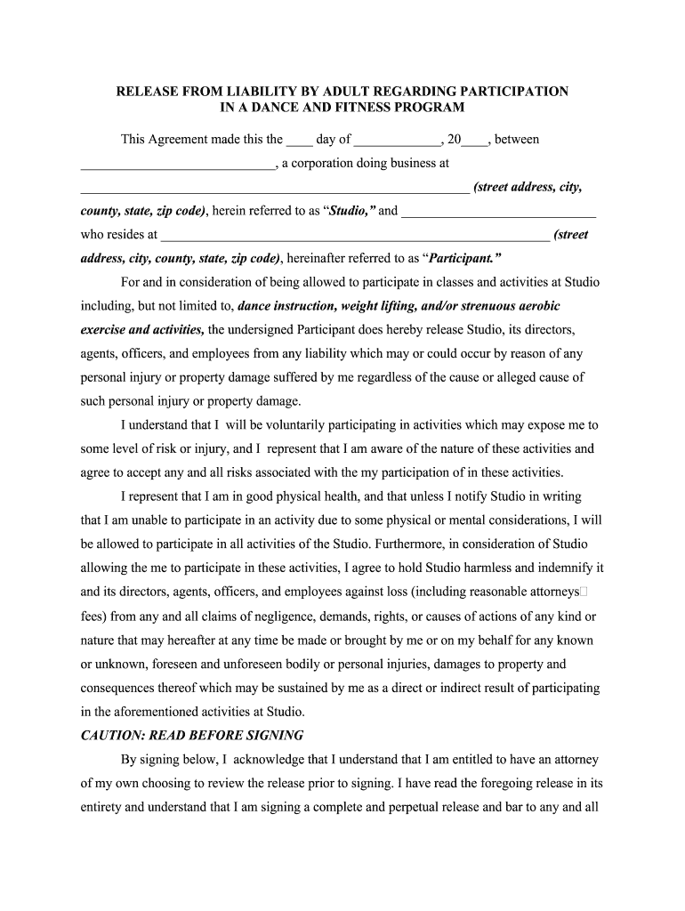 RELEASE FROM LIABILITY BY ADULT REGARDING PARTICIPATION IN A DANCE AND FITNESS PROGRAM This Agreement made this the day of, 20, between, a corporation doing business at (street address, city, county,