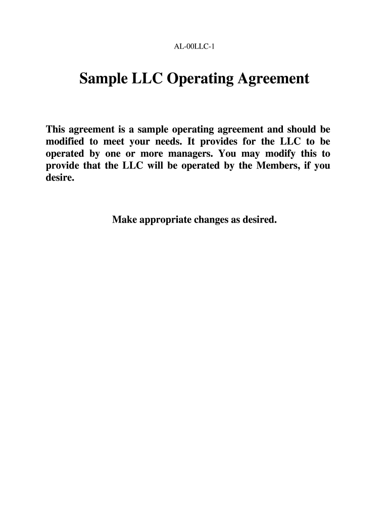 AL00LLC1Sample LLC Operating Agreement This agreement is a sample operating agreement and should be modified to meet your needs. It provides for the LLC to be operated by one or more managers. You
