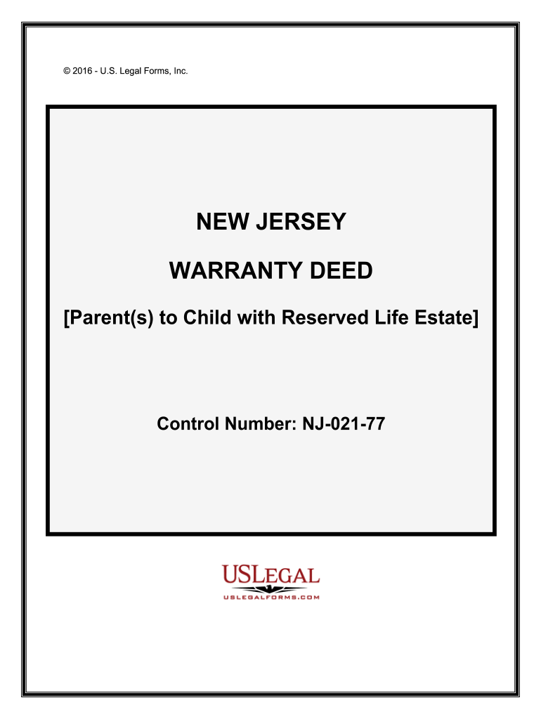 2016 U.S. Legal Forms, Inc. NEW JERSEY WARRANTY DEED Parent(s) to Child with Reserved Life Estate Control Number: NJ02177I. TIPS ON COMPLETING THE FORMS The form(s) in this packet may contain form