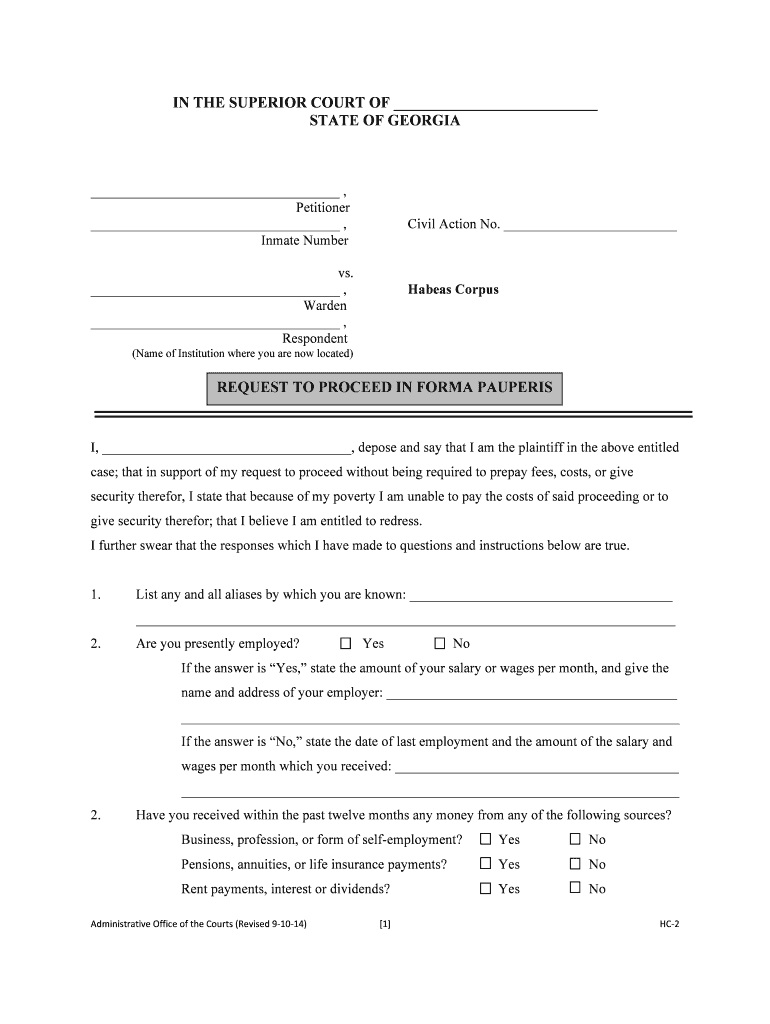 Get the free Georgia Request to Proceed in Forma Pauperis - Habeas Corpus