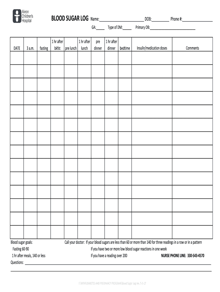 BLOOD SUGAR Cognate: DOB: Phone #: GA: DATE3 a.m.fasting1 hr after 1 hr after best PRE lunch dinnertime of DM: Primary OB: 1 hr after dinner bedtimeInsulin/medication dosesCommentsBlood sugar goals: