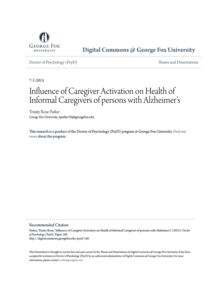 Digital Commons George Fox University Doctor of Psychology (PSD)Theses and Dissertations712015Influence of Caregiver Activation on Health of Informal Caregivers of persons with Alzheimer's Trinity