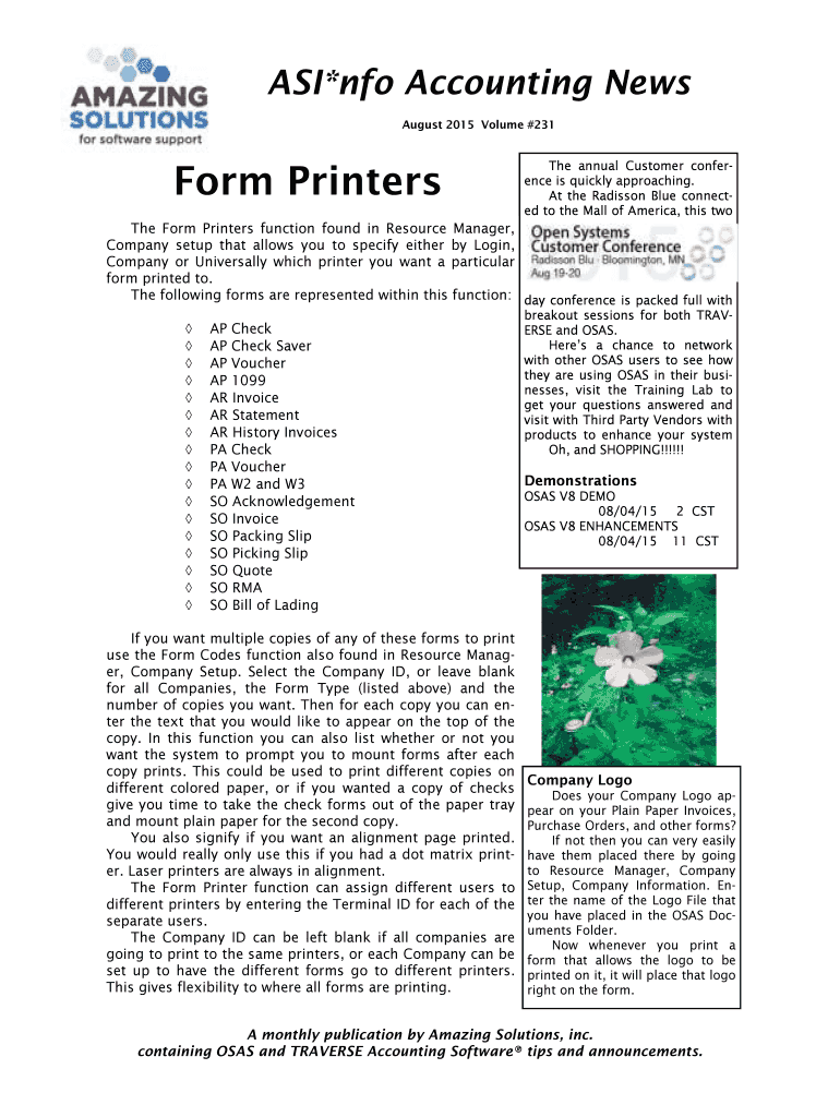 AS×no Accounting News August 2015 Volume #231Form Printers annual Customer conference is quickly approaching. At the Radisson Blue connected to the Mall of America, this tooth Form Printers function