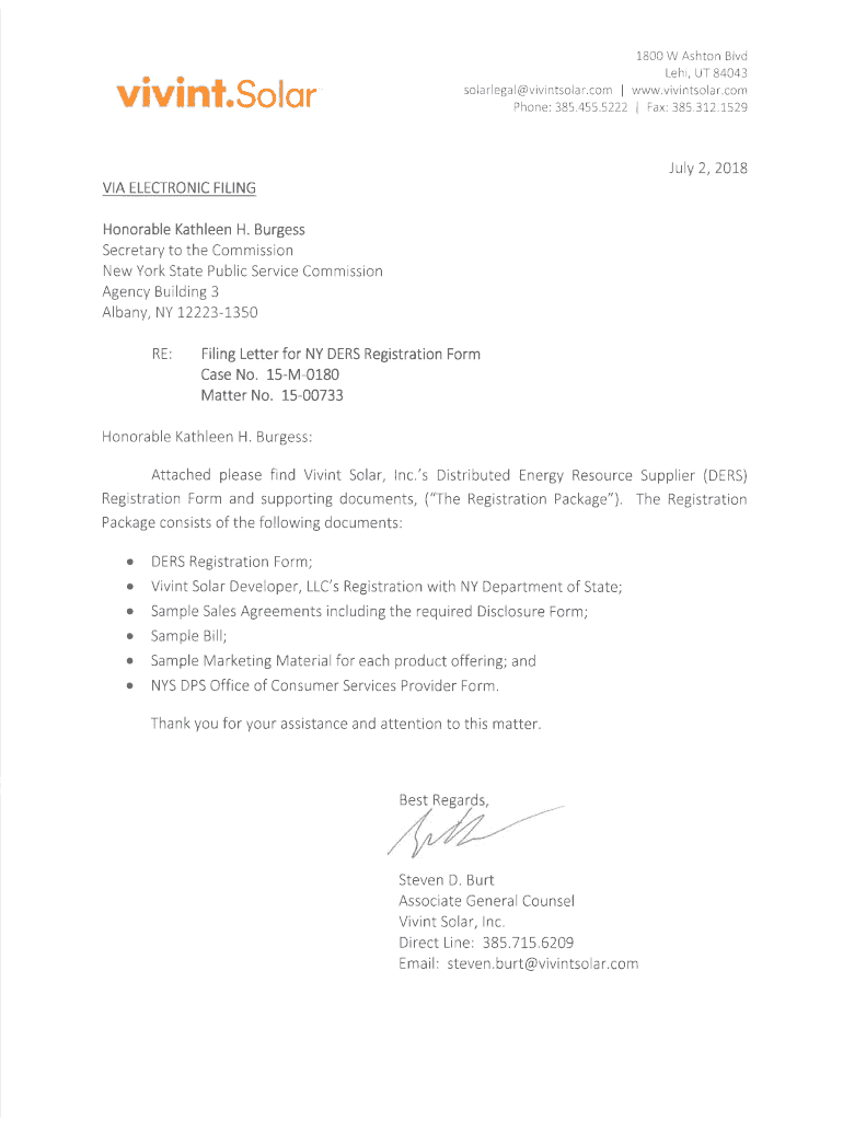 Phone: 385.455.5222 I Fax: 385.312.1529vivint. Solar July 2, 2018VIA ELECTRONIC FILING