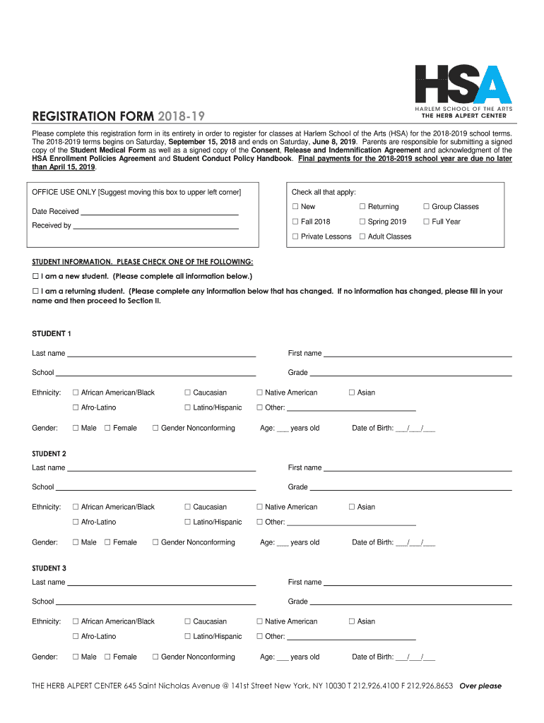 Please complete this registration form in its entirety in order to register for classes at Harlem School of the Arts (HSA) for the 20182019 school terms.