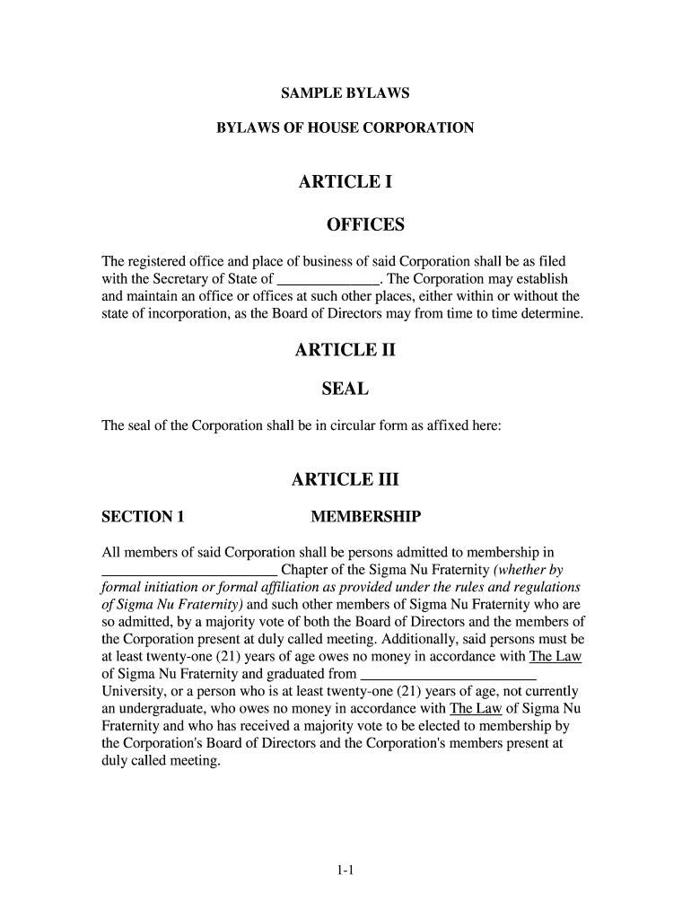 SAMPLE BYLAWS OF HOUSE CORPORATIONARTICLE I OFFICES The registered office and place of business of said Corporation shall be as filed with the Secretary of State of. The Corporation may establish
