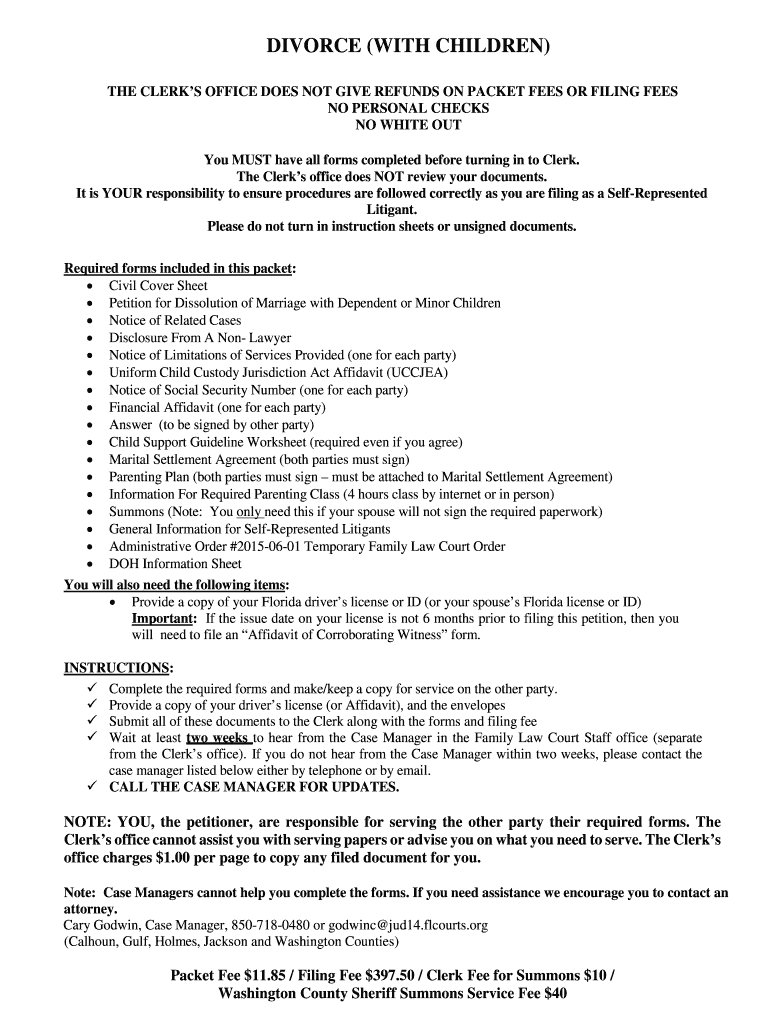 DIVORCE (WITH CHILDREN) THE CLERKS OFFICE DOES NOT GIVE REFUNDS ON PACKET FEES OR FILING FEES NO PERSONAL CHECKS NO WHITE OUT You MUST have all forms completed before turning in to Clerk. The Clerks'