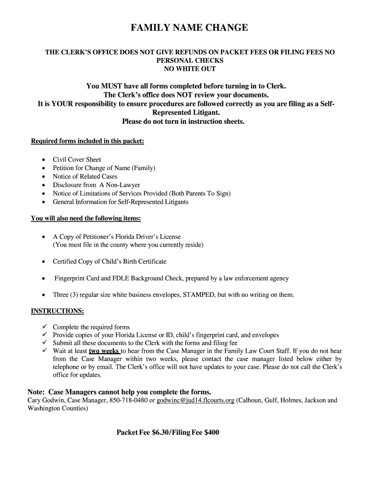 FAMILY NAME CHANGE THE CLERKS OFFICE DOES NOT GIVE REFUNDS ON PACKET FEES OR FILING FEES NO PERSONAL CHECKS NO WHITE Outdo MUST have all forms completed before turning in to Clerk. The Clerks' office