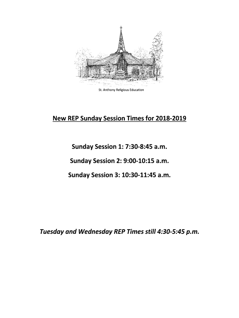 St. Anthony Religious Education REP Sunday Session Times for 20182019Sunday Session 1: 7:308:45 a.m. Sunday Session 2: 9:0010:15 a.m. Sunday Session 3: 10:3011:45 a.m. Tuesday and Wednesday REP Times