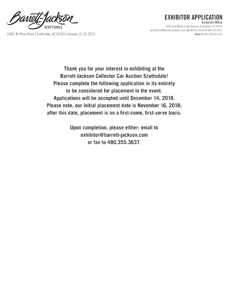 EXHIBITOR APPLICATION Corporate OfficeSCOTTSDALE16601 N. Lima Road Scottsdale, AZ 85260 January 1220, 20197400 East Monte Crisco Avenue, Scottsdale, AZ 85260 e exhibitor barrettjackson.com p 480.421.6694
