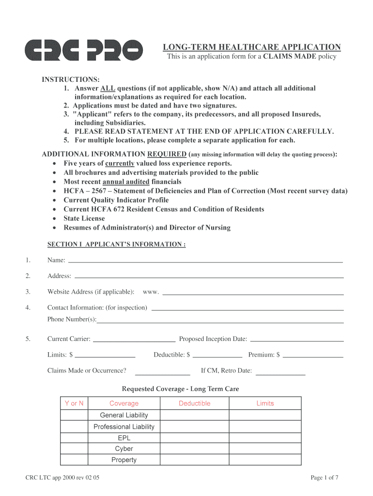 The Long-Term Healthcare Application Form is a document used by healthcare facilities to apply for a CLAIMS MADE policy, requiring detailed operational and claims history information.