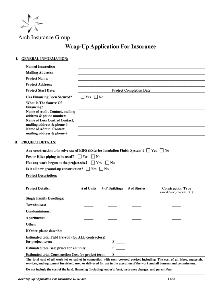 The Wrap-Up Application For Insurance is a business form used by construction teams to apply for wrap-up insurance coverage through Arch Insurance Group, ensuring comprehensive protection for projects.