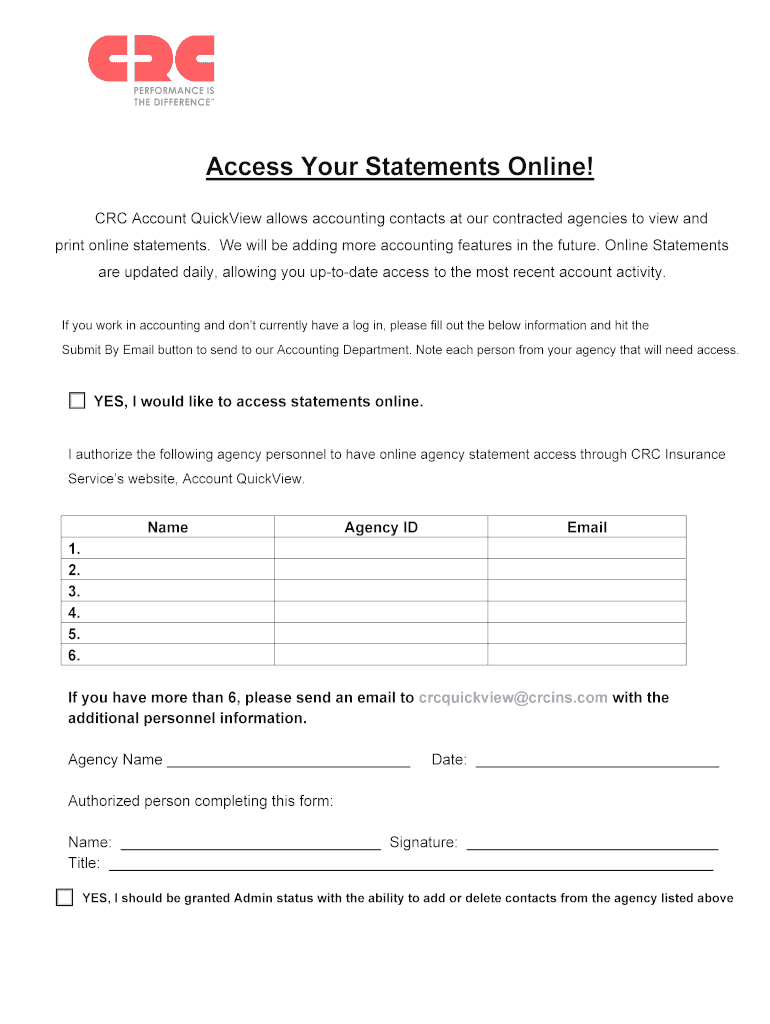 Designed for accounting contacts at contracted agencies, it ensures that the correct individuals can efficiently obtain necessary financial statements, also known as crc insurance online statements. The significance of this form lies in its ability to grant streamlined access to essential accounting information.