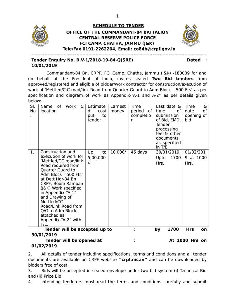 1 SCHEDULE TO TENDER OFFICE OF THE COMMANDANT84 BATTALION CENTRAL RESERVE POLICE FORCE FCI CAMP, CHAT HA, JAMMY (J&K) Tell/Fax 01912262204, Email: co84b RPF.gov.in Tender Inquiry No. B. V1/20181984Q(SRE)
