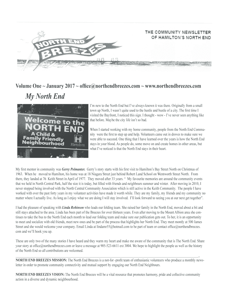Volume One January 2017 office northendbreezes.com www.northendbreezes.comMy North End I'm new to the North End, but I've always known it was there. Originally from a small town up North, I wasn't