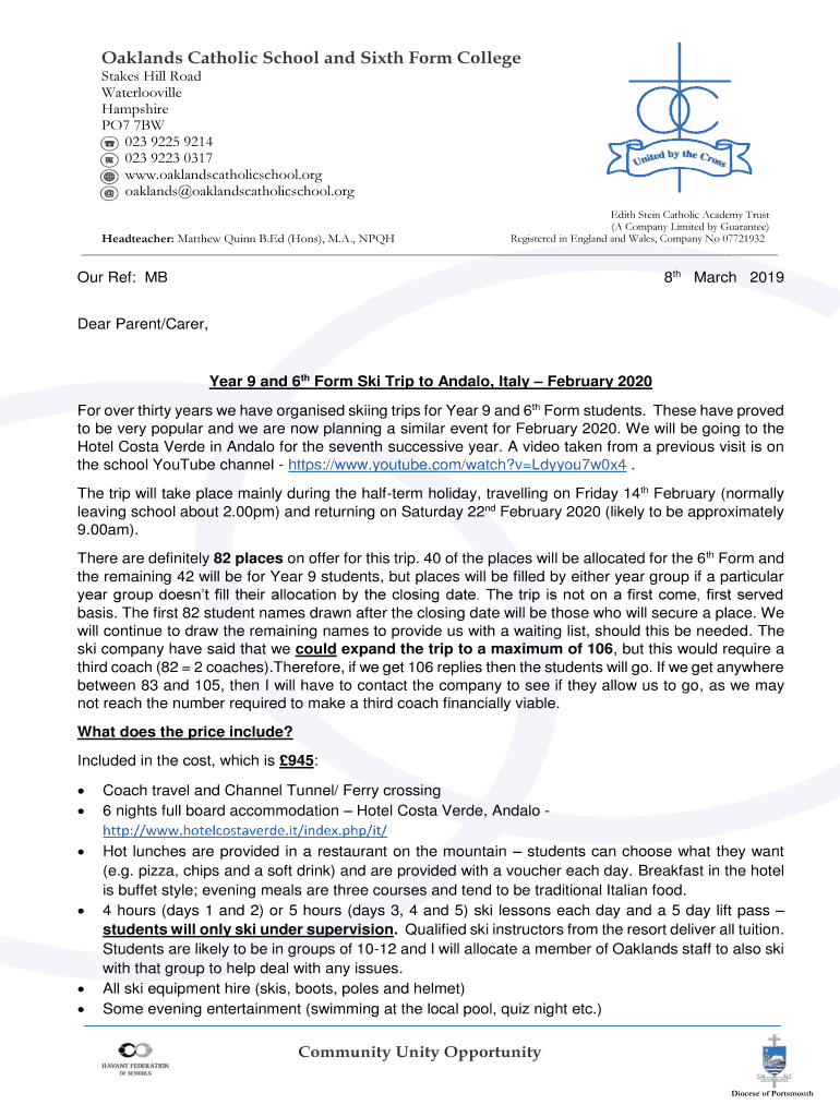 Get the free Year 9 and 6th Form Ski Trip to Andalo, Italy February 2020