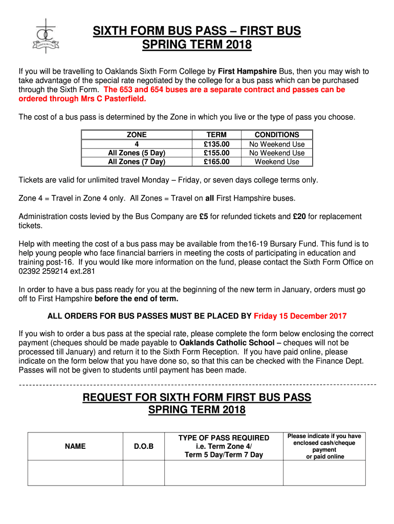 SIXTH FORM BUS PASS FIRST BUS SPRING TERM 2018 If you will be travelling to Oakland's Sixth Form College by First Hampshire Bus, then you may wish to take advantage of the special rate negotiated
