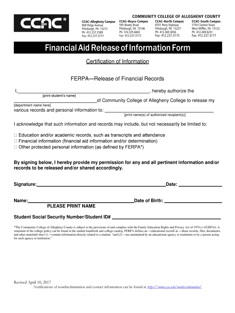 Financial Aid Release of Information Form Certification of Information FERPARelease of Financial Records I, hereby authorize the print students name of Community College of Allegheny College to release