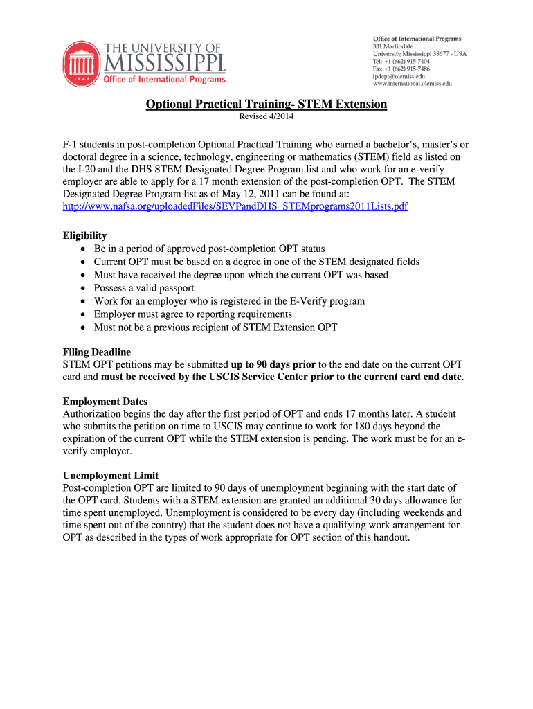 To be eligible for the STEM Extension OPT, you must be an F-1 student who has completed a degree in a STEM field and is currently participating in post-completion Optional Practical Training.