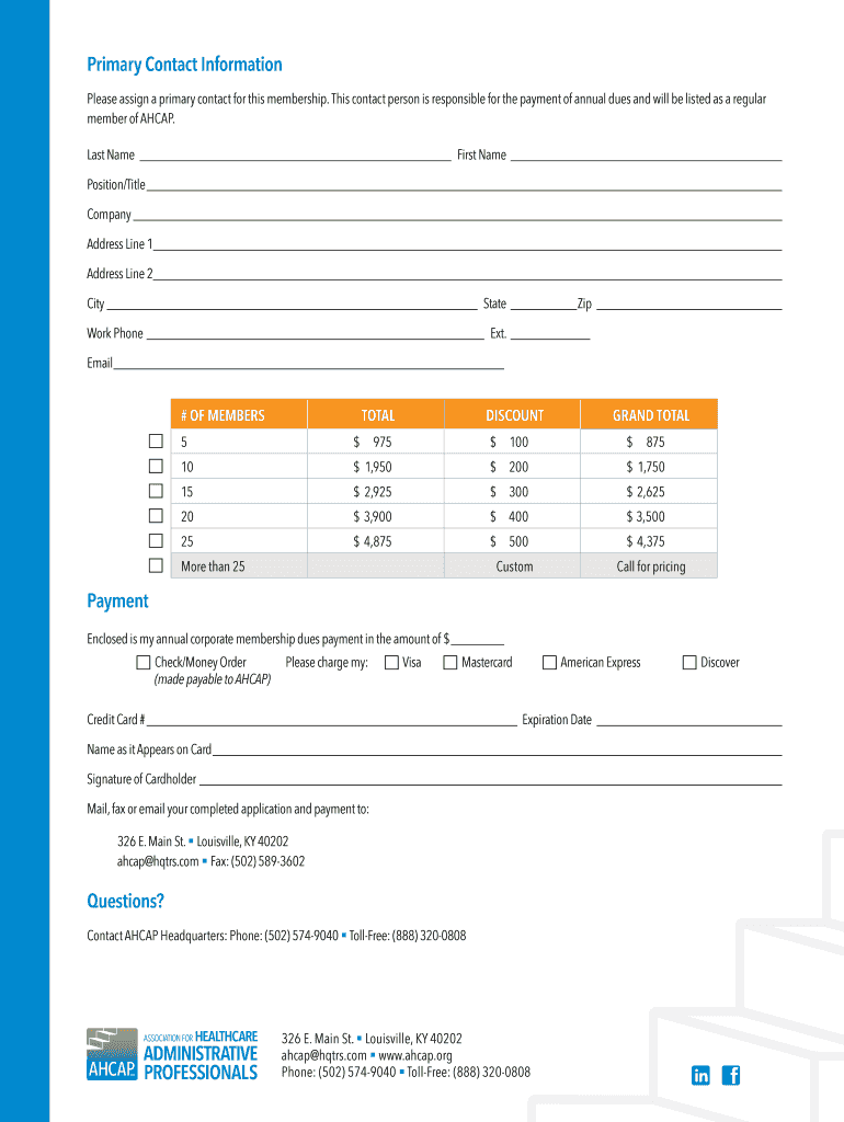 HEALTHCARE FACILITY & HOSPITAL ASSOCIATIONCORPORATE MEMBERSHIP APPLICATIONCorporate membership in HCAP is available to hospitals, healthcare facilities, state and metropolitan healthcare associations,
