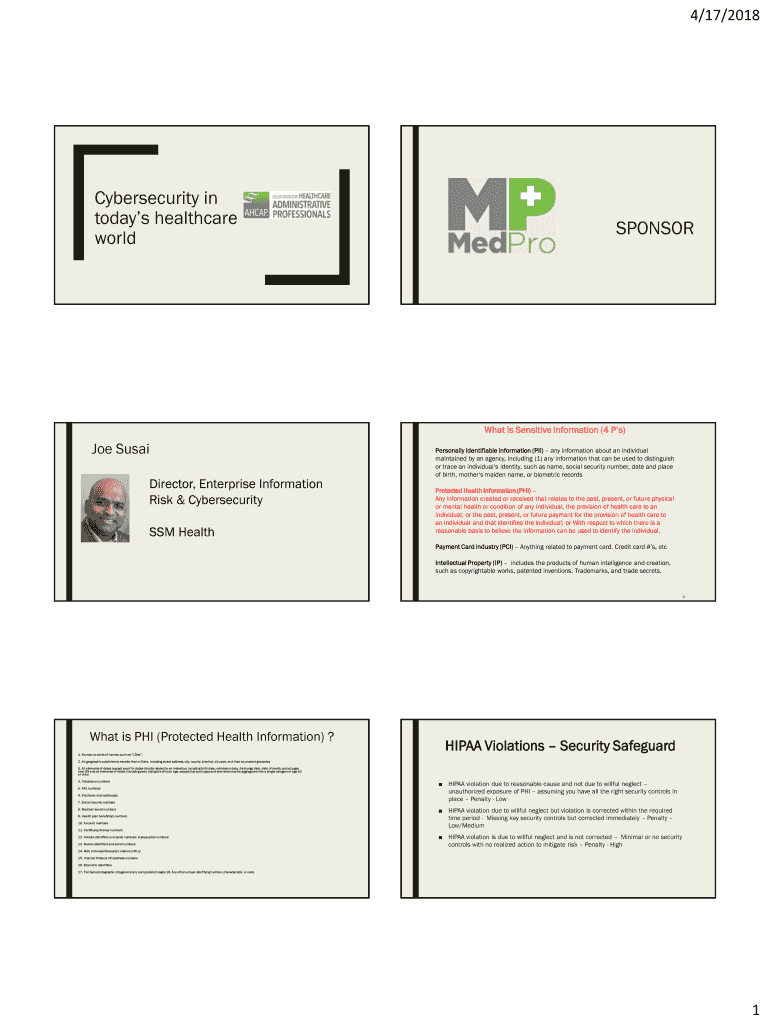 4/17/2018Cybersecurity in today's healthcare worldSPONSORWhat is Sensitive Information (4 PS)Joe Susie Director, Enterprise Information Risk & Cybersecurity SSM HealthPersonally Identifiable Information