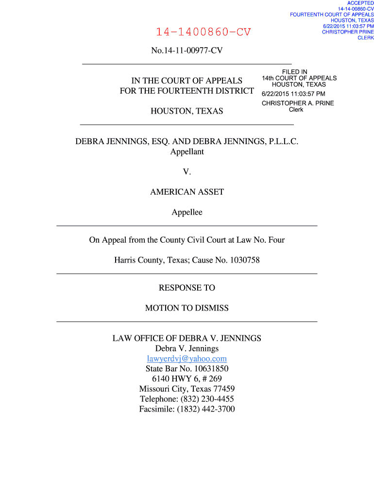 ACCEPTED 141400860CV FOURTEENTH COURT OF APPEALS HOUSTON, TEXAS 6/22/2015 11:03:57 PM CHRISTOPHER PRINCE CLERK141400860CVNo.141100977CV IN THE COURT OF APPEALS FOR THE FOURTEENTH DISTRICTFILED IN