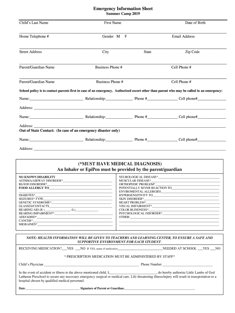 Get the free Emergency Information Sheet Summer Camp 2019