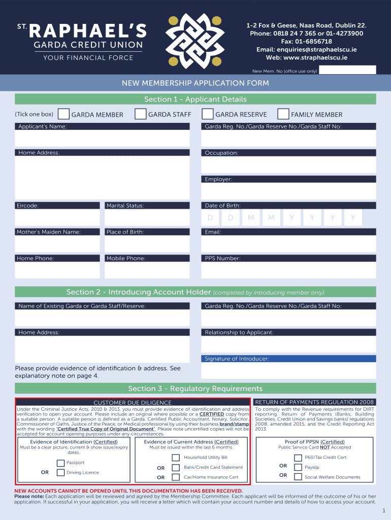 12 Fox & Geese, Haas Road, Dublin 22. Phone: 0818 24 7 365 or 014273900 Fax: 016856718 Email: inquiries straphaelscu.i.e. Web: www.straphaelscu.ie New Me. No (office use only)NEW MEMBERSHIP APPLICATION