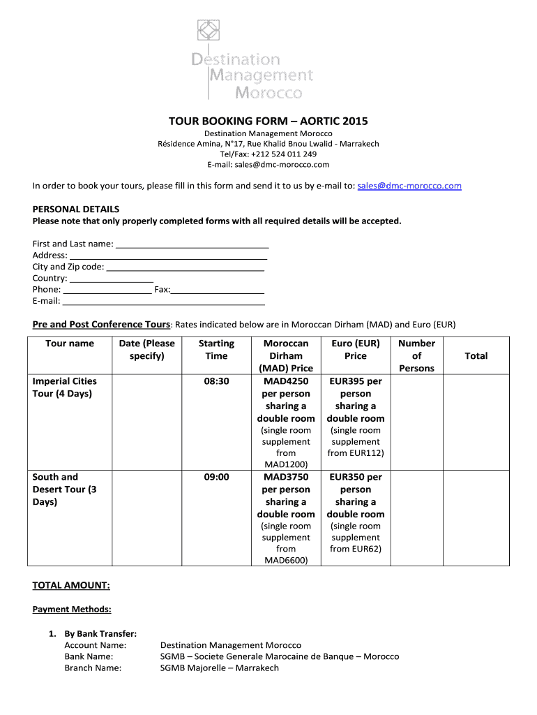 TOUR BOOKING FORM AORTIC 2015 Destination Management Morocco Residence Amina, N17, Rue Khalid BNO Laid Marrakech Tel/Fax: +212 524 011 249 Email: sales Morocco. Coming order to book your tours, please