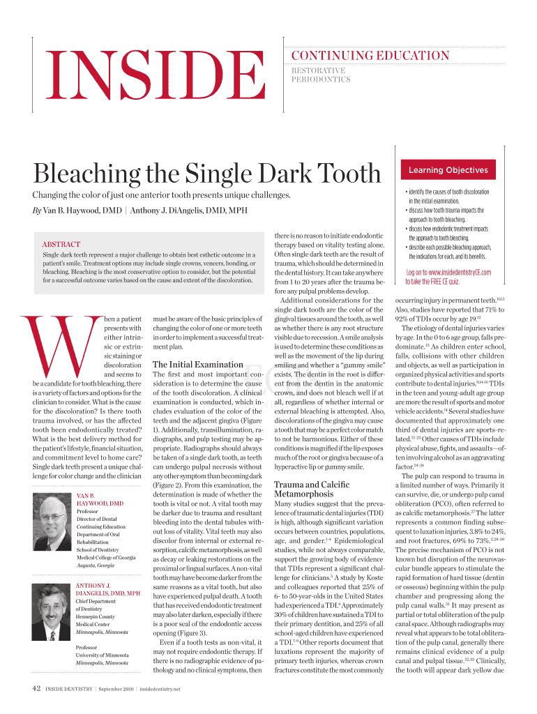 Inside continuing Education Restorative PeriodonticsBleaching the Single Dark Tooth Changing the color of just one anterior tooth presents unique challenges. By Van B. Haywood, DMD Anthony J. Angeles,