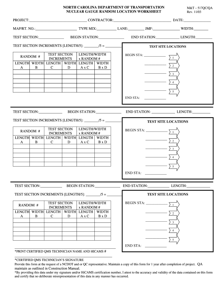 NORTH CAROLINA DEPARTMENT OF TRANSPORTATION NUCLEAR GAUGE RANDOM LOCATION WORKSHEET 517QC/QA Rev. 11/03PROJECT: CONTRACTOR: DATE: MAP/RT. NO.: TYPE MIX: LANE: JMF: WIDTH: TEST SECTION: BEGIN STATION: