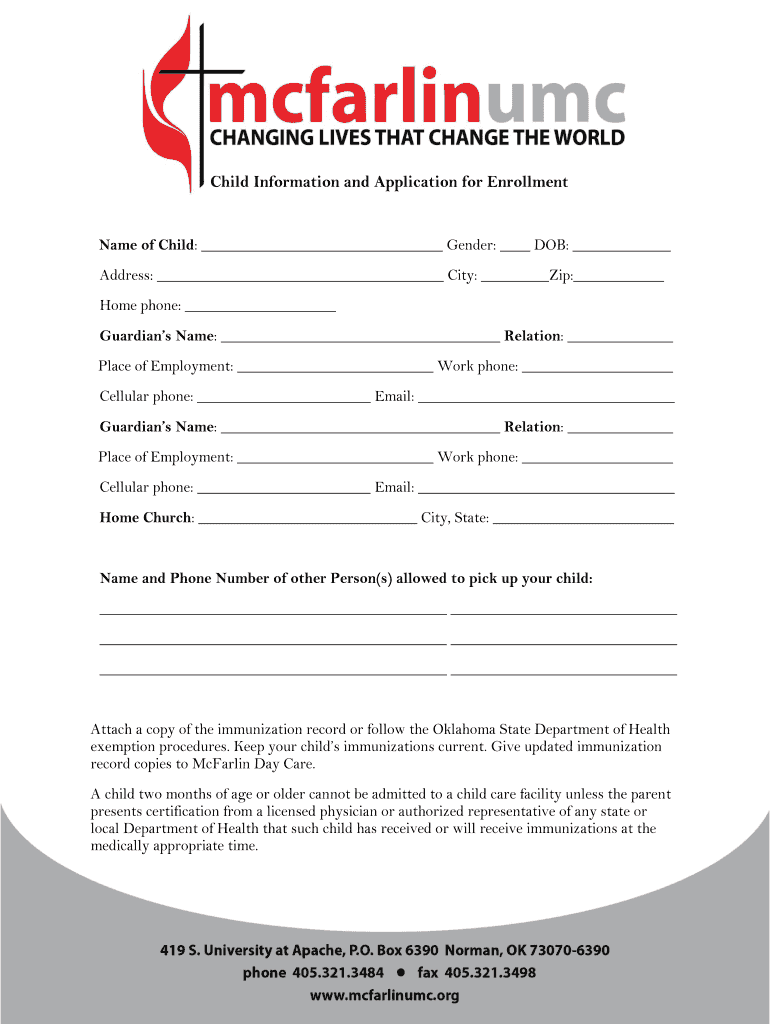 Child Information and Application for EnrollmentName of Child: Gender: DOB: Address: City: Zip: Home phone: Guardians Name: Relation: Place of Employment: Work phone: Cellular phone: Email: Guardians