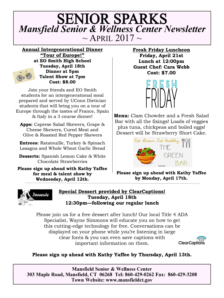 SENIOR SPARKS Mansfield Senior & Wellness Center Newsletter APRIL 2017 Annual Intergenerational Dinner Tour of Europe! At EO Smith High School Tuesday, April 18th Dinner at 5pm Talent Show at 7pm