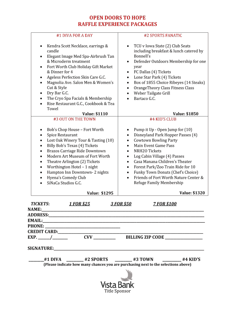 OPEN DOORS TO HOPE RAFFLE EXPERIENCE PACKAGES #1 DIVA FOR A DAY #2 SPORTS FANATIC Kendra Scott Necklace, earrings & candle Elegant Image Med Airbrush Tan & treatment Fort Worth Club Holiday Gift Market