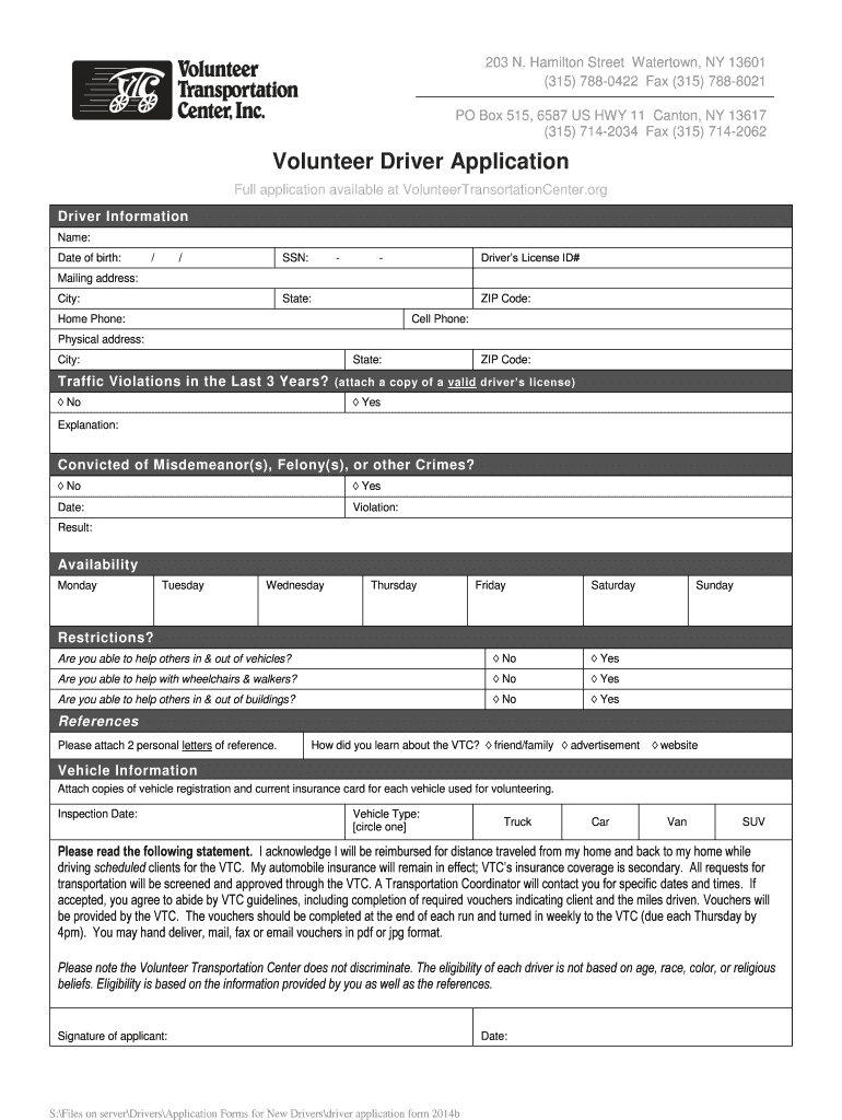 (315) 7142034 Fax (315) 7142062Volunteer Driver Application
