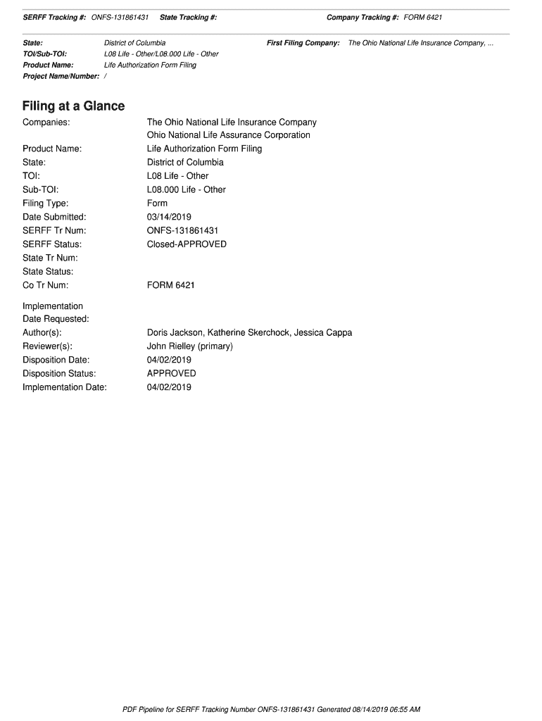 SERFS Tracking #: ONFS131861431State Tracking #:State:District of Columbia/Subtle:L08 Life Other/L08.000 Life Overproduce Name:Life Authorization Form FilingCompany Tracking #: FORM 6421First Filing