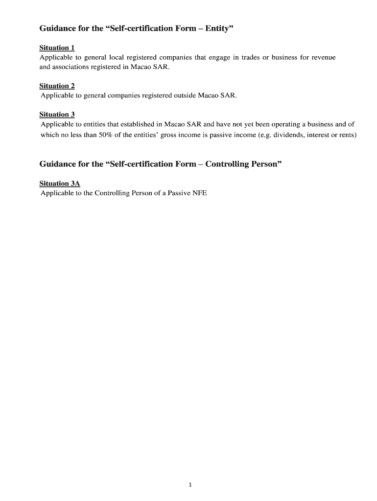 Guidance for the Self certification Form Entity Situation 1 Applicable to general local registered companies that engage in trades or business for revenue and associations registered in Macao SAR.