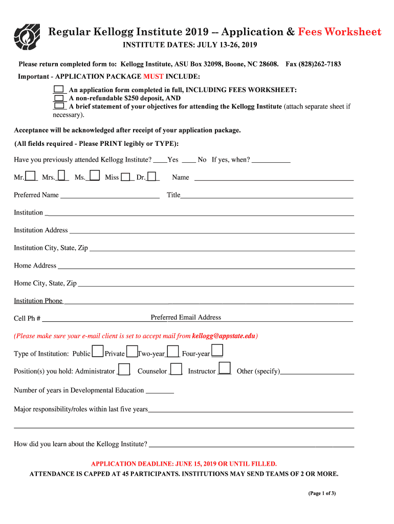 Regular Kellogg Institute 2019 Application & Fees Worksheet INSTITUTE DATES: JULY 1326, 2019 Please return completed form to: Kellogg Institute, ASU Box 32098, Boone, NC 28608. Fax (828)2627183 Important