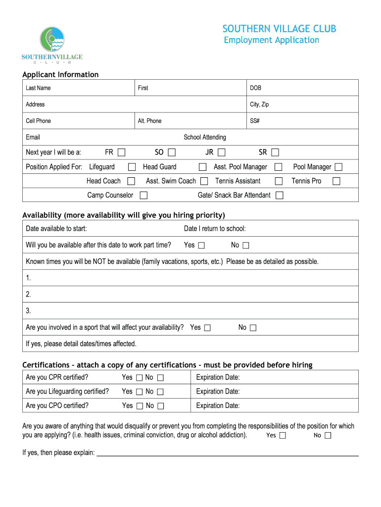 Last NameFirstDOBAddressCity, Cell Phone. PhoneEmailSS×School AttendingNext year I will be a:FR SO JR SR Position Applied For: Lifeguard