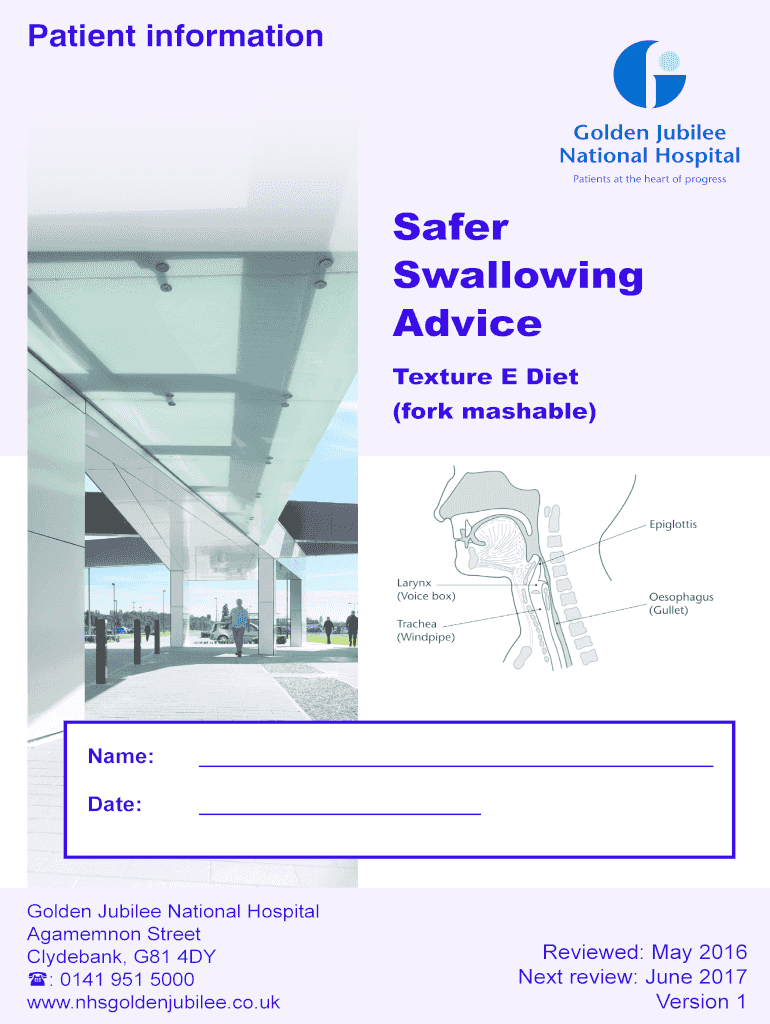 Patient informationSafer Swallowing Advice Texture E Diet (fork Mashable)Name: Date: Golden Jubilee National Hospital Agamemnon Street Clyde bank, G81 4DY (: 0141 951 5000 www.nhsgoldenjubilee.co.ukReviewed: