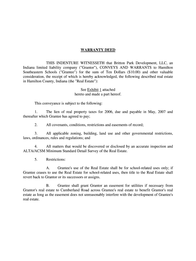 WARRANTY DEED THIS INDENTURE WITNESSED that Britton Park Development, LLC, an Indiana limited liability company (Granter “), CONVEYS AND WARRANTS to Hamilton Southeastern Schools (Grantee “) for