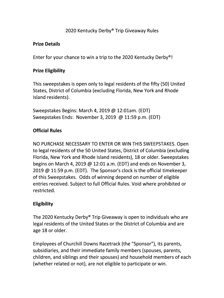 2020 Kentucky Derby Trip Giveaway Rules Prize Details Enter for your chance to win a trip to the 2020 Kentucky Derby! Prize Eligibility These sweepstakes is open only to legal residents of the fifty