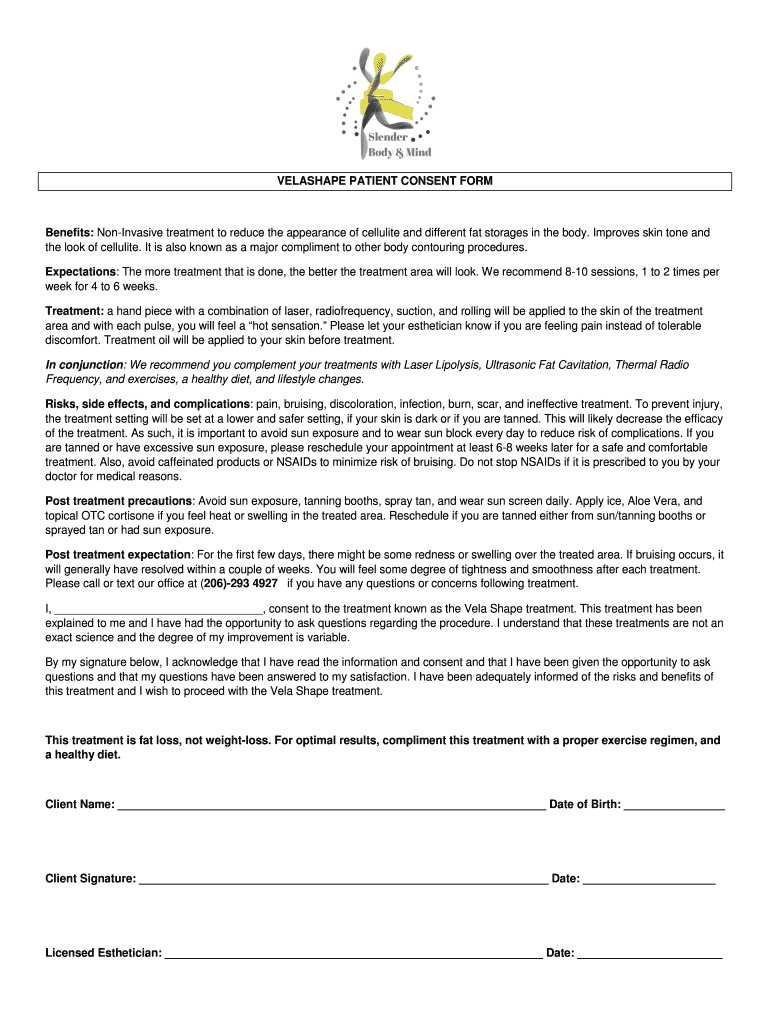 Any patient who is planning to undergo velashape treatment needs to fill out the velashape patient consent form.